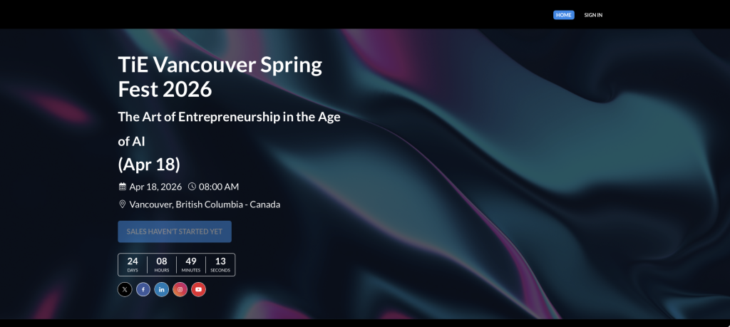 Join us for the TIE Vancouver Spring Fest 2026 featuring the Art of Entrepreneurship in the age of AI. Showcasing key note by internationally acclaimed venture capitalists and AI experts with a pitch fest.